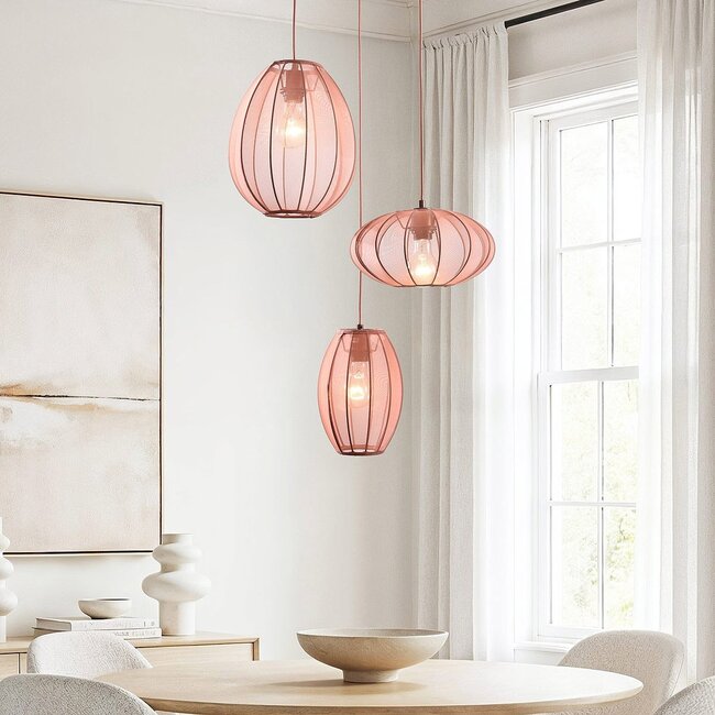 Die Pendelleuchte Velora strahlt Ruhe und Wärme aus, dank der Verwendung von weichen, rosafarben Stoffschirmen und einer raffinierten Verarbeitung. Durch die Kombination von Textilien, runden Formen und warmen Farbtönen eignet sich diese Leuchte hervorragend für Interieurs im Japandi-, Boho- oder Modern-Stil. Das gedämpfte Licht erzeugt einen stimmungsvollen Schein, ideal über einem Esstisch oder in einem offenen Raum.
