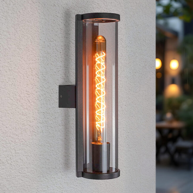 Die Halterung der Wandleuchte ist in Anthrazit gehalten und verleiht ihr einen modernen Look. Der längliche Zylinder der Leuchte ist transparent, sodass man das Leuchtmittel gut sehen kann. Dadurch entsteht ein interessanter visueller Effekt und das Licht scheint schön durch den Zylinder. Die Kombination aus Form und Farbe verleiht der Leuchte einen eleganten und raffinierten Look und macht sie zu einer schicken Ergänzung für Ihre Außenwand.