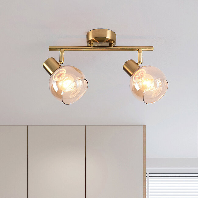 Ergänzen Sie Ihr Interieur mit dieser luxuriösen Deckenleuchte. Dem Messing, goldene Rahmen in Kombination mit dem amber Glas verleiht ihr einen glamourösen Look. Amber Glas sorgt für einen warmen und sanften Schein, während die goldene Leuchte Glamour ausstrahlt. Die beiden Strahler sind drehbar, sodass Sie die Richtung des Lichts steuern können.