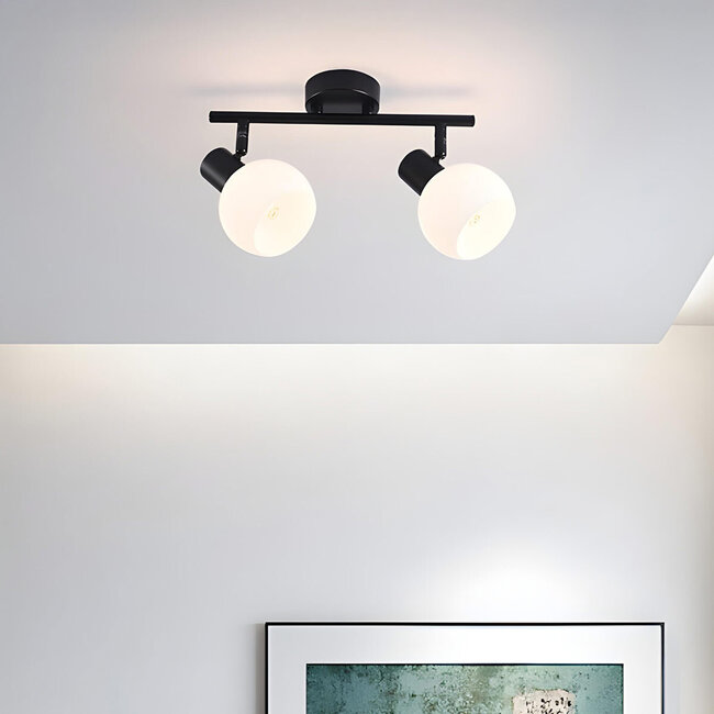 Der Deckenstrahler Phiene hat eine Breite von 30 cm, eine Höhe von 17,5 cm und die Glasschirme messen Ø11 x 7 cm. Die Deckenplatte hat eine Größe von Ø9 x 2,5 cm. Der Sockel dieser Deckenleuchte besteht aus schwarzem Metall mit milchig weißen oder amber Glasschirmen. Die Strahler sind beide drehbar.