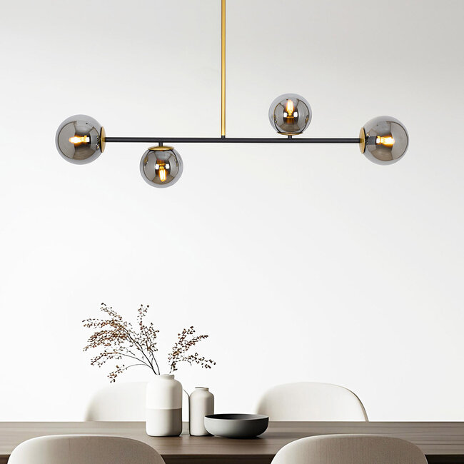 Davy mit vier Glaskugeln ist mit Rauchglas oder Milchglas erhältlich. In der gleichen Kollektion haben wir auch die Hängeleuchte Danley mit zwei Glaskugeln, die Hängeleuchte Danny mit drei Glaskugeln und die Hängeleuchte Damian mit sechs Glaskugeln.