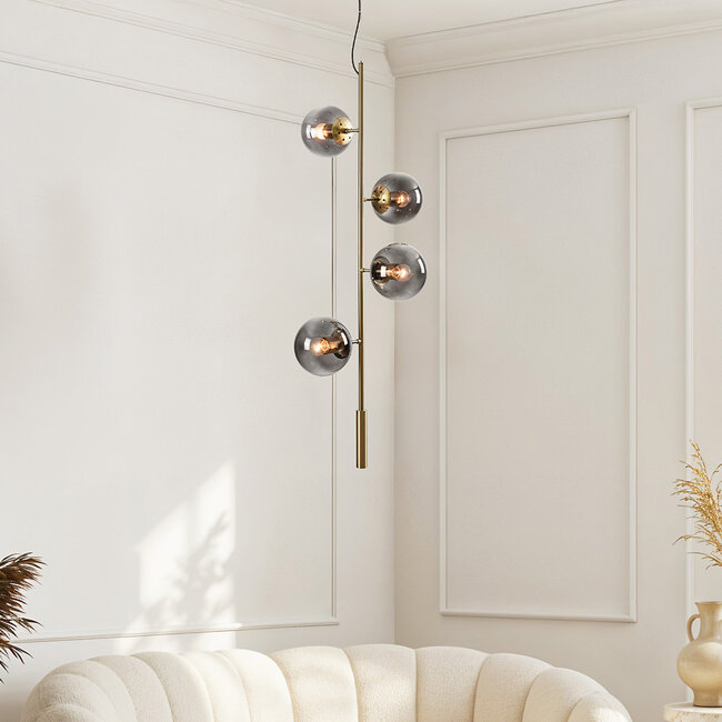 Lassen Sie sich von der Pracht von Ferron verzaubern. Bei dieser Hängeleuchte tanzen vier Rauchglaskugeln spielerisch um einen golden schimmernden Stab. Das Rauchglas erzeugt ein weiches Licht, das Wärme und Atmosphäre schafft. Die Anordnung der Kugeln verleiht dem Design ein spielerisches Element und verleiht der Leuchte einen einzigartigen Charakter. Der goldene Stab verleiht Ferron Eleganz und passt in schlichte Innenräume. Genießen Sie die perfekte Kombination aus Stil und Funktionalität mit dieser schönen Hängeleuchte, die Ihren Raum mit Raffinesse und Schönheit bereichert.