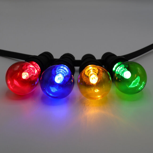 Möchten Sie Ihrem Garten, Ihrer Party oder Ihrem Restaurant eine gewisse Atmosphäre verleihen? Unsere bunten 1 Watt LED-Glühbirnen sorgen für einen wunderbaren Lichteffekt und sind mit bunt leuchtenden 15 bis 25 Watt Glühbirnen vergleichbar. Die Abdeckung der Glühbirne sorgt in Kombination mit den bunt leuchtenden LEDs für eine besonders glanzvolle Farbe. Diese Glühbirne verfügt über eine große Abdeckung mit einem Durchmesser von 60 Millimetern, wodurch sie einer klassischen Glühbirne ähnelt. Die Linse sorgt für eine schöne, klare Lichtverteilung.