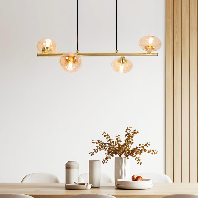 Setzen Sie auf eine schicke und verspielte Lichtwirkung mit luxuriösen Glaskolben. Soikea ist eine Design-Hängeleuchte mit einem schlanken Rahmen und vier spielerisch platzierten Glaskugeln. Die einzigartigen Glaskolben sind in amber Glas ausgeführt. In Kombination mit dem goldenen Rahmen entsteht ein stilvoller Look. Mit ihrem minimalistischen Design passt die Hängeleuchte gut zu modernen Einrichtungen und ist eine sehr gute Wahl für über dem Esstisch, einer Kücheninsel oder in der Nähe der Sitzecke.