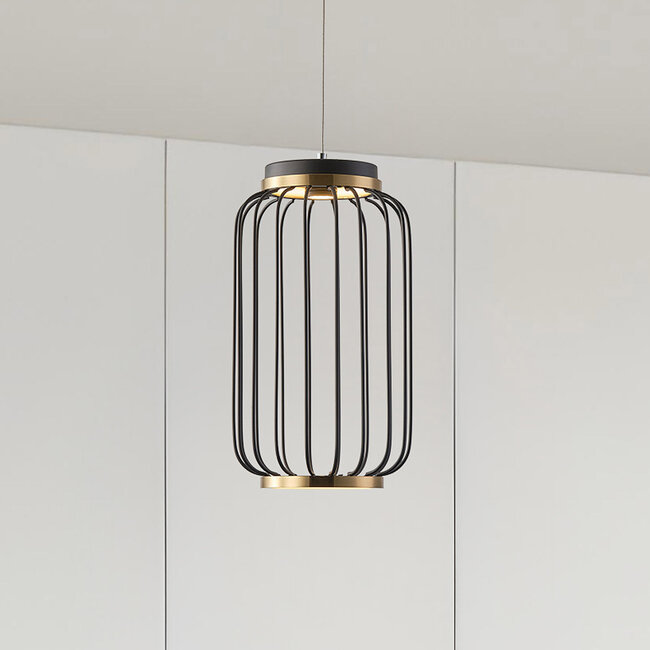 Mit ihrem einzigartigen Design ist Puri ein schöner Blickpunkt für mehrere Räume. Der schwarze Käfigrahmen mit goldenen Details erzeugt einen spielerischen Lichteffekt, der Schatten an der Wand und auf den Möbeln bildet. Die Lampe kann als Blickfang im Wohnzimmer, über dem Esstisch oder sogar im Büro verwendet werden. Die Lampe ist leicht zu kürzen, sodass Sie entscheiden können, wie hoch Puri hängt. Das Eisengestell ist von stabiler Qualität. So haben Sie jahrelang Freude an Puri.