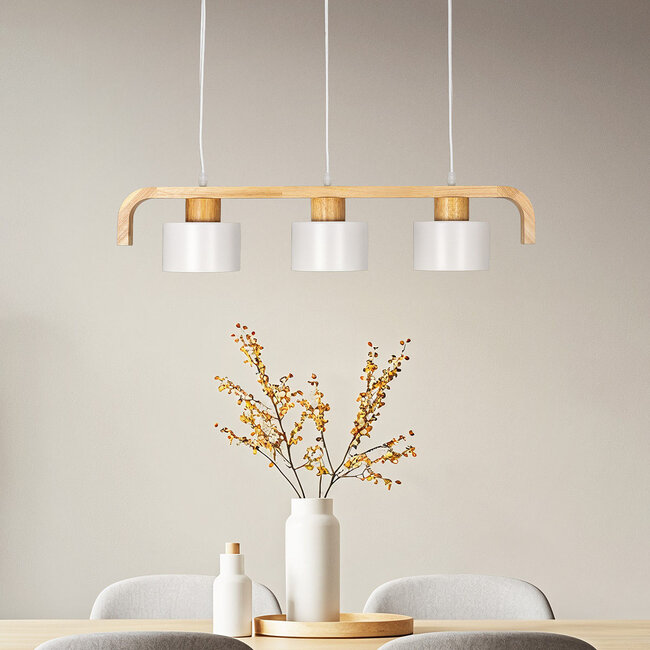 Rosie ist ein nostalgisches Prunkstück, das jedem Raum einen Vintage-Charme verleiht. Mit ihren drei Fassungen bietet Rosie genügend Licht, um den Raum zu erhellen. Sie können zwischen weißen oder grünen Lampenschirmen wählen. Mit den farbigen Schirmen in Kombination mit dem Holz passt Rosie gut in helle Innenräume. Ob über einem Esstisch, in der Küche oder im Flur, diese Retro-Pendelleuchte schafft ein warmes und gemütliches Ambiente. Kombinieren Sie Rosie mit der Stehleuchte Elsie und vervollständigen Sie das Bild.