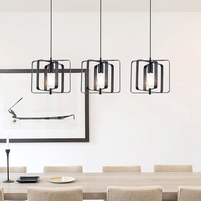 Das längliche Design hat eine Länge von 90 cm, eine Breite von 30 cm und eine maximale Höhe von 150 cm. Die Aufhängeschnüre sind verstellbar, damit Sie die Leuchte in der gewünschten Höhe aufhängen können. Die offenen Schirme sind aus Metall mit schwarzer Oberfläche. Die Lampe ist von solider Qualität und hat die Schutzart IP20. Sie ist nur für den Innenbereich geeignet. Sehen Sie sich hier das Handbuch an.