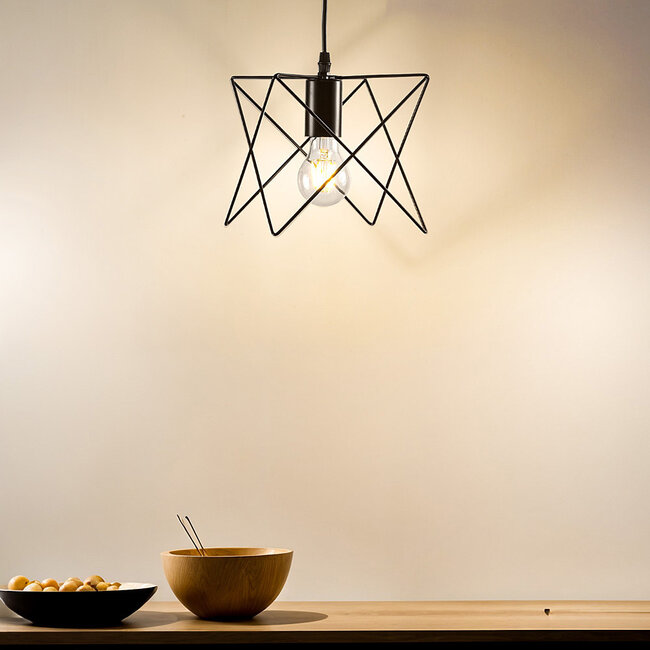 Minimalistisch, industriell oder modern: Diese Hängelampe, genannt Star, kann auf viele Arten beschrieben werden. Die Pendelleuchte besteht aus einer schnurgebundenen Hängeleuchte, die von einem sternförmigen Metallschirm umgeben ist. Der Schirm ist aus feinen Metalllinien gefertigt, die den industriellen Einrichtungstrend perfekt einfangen. Ein auffälliges Design in seiner ganzen Schlichtheit. Die schönen Linien in der offenen Haube erzeugen ein schönes Lichtspiel. Die mattschwarze Armatur bietet Platz für ein E27-Leuchtmittel (nicht im Lieferumfang enthalten). Dank des offenen Designs kommt die Lichtquelle optimal zur Geltung. Platzieren Sie eine dekorative LED-Filament-Lichtquelle, um zusätzliche Atmosphäre zu schaffen, oder kombinieren Sie Star mit einer Lichtquelle mit amber Glas für einen warmen Lichteffekt. Star ist eine echte Begleitlampe und hängt gerne mit Gleichaltrigen ab. Für zusätzliche Beleuchtung und Gemütlichkeit hängen Sie mehrere Lampen nebeneinander auf.