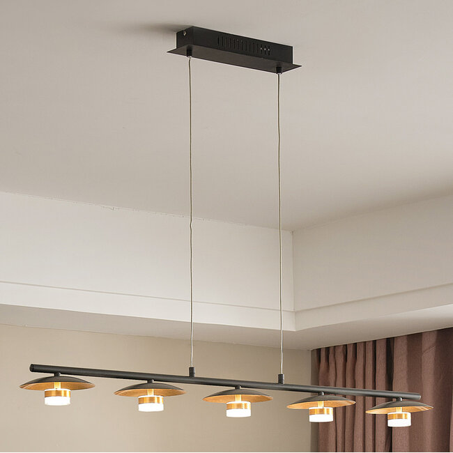 Die Höhe der Martha beträgt 120 cm, die Tiefe 15 cm und die Breite 104 cm. Aufgrund ihrer Form und Größe passt diese Hängeleuchte sehr gut über einen Tisch oder eine Arbeitsfläche. Das kann Ihr Esstisch sein, aber diese Lichtquelle wird sich auch in Ihrem Arbeitszimmer wohlfühlen. Die Kombination aus Schwarz und Gold lässt Martha reich und elegant aussehen. Wenn Sie Martha in Ihre Einrichtung integrieren, erhalten Sie eine klassisch aussehende Lampe mit moderner Funktionalität wie LED-Beleuchtung und Dimmer.
