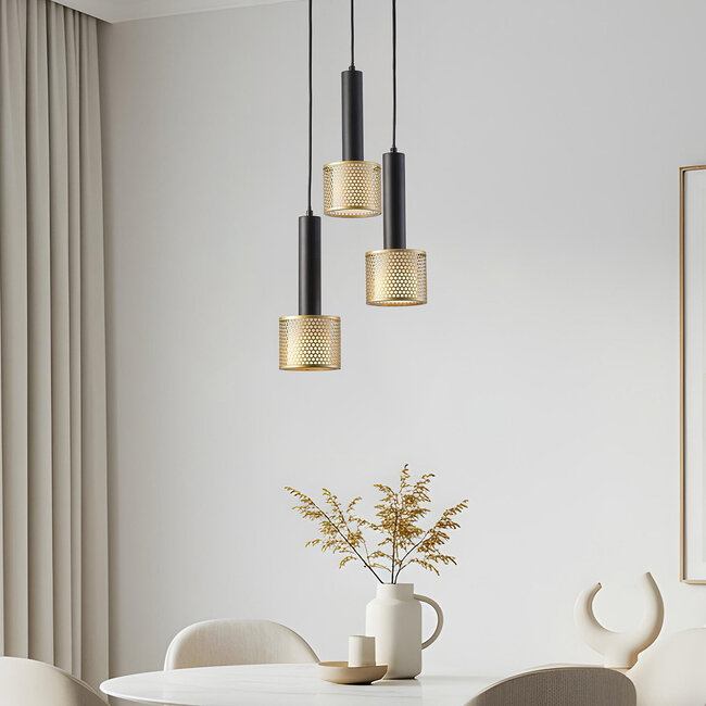 Sind Sie auf der Suche nach einer Pendelleuchte mit einzigartigem Design? Die drei Pendel sind stufenförmig an der Leuchte angebracht, um einen spielerischen Effekt zu erzielen. Der Metallrahmen ist mattschwarz, die drei Metallschirme sind goldfarben und haben ein sechseckiges, wabenförmiges Design. Im Inneren des goldenen Schirms befindet sich eine Hülle aus Milchglas, die als Diffusor fungiert und für weiches Licht und ein warmes Ambiente sorgt. Daher eignet sich diese Lampe hervorragend für einen runden Esstisch, an dem Sie abends eine gemütliche Atmosphäre schaffen möchten.