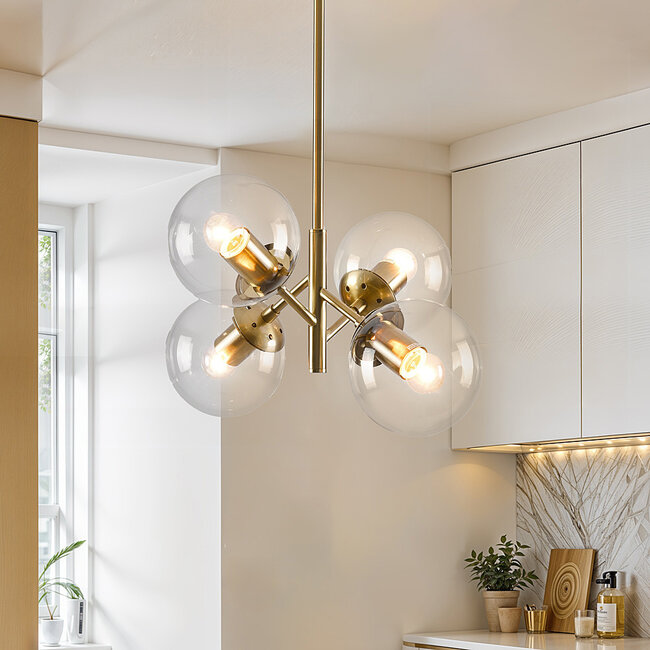 Geef jouw ruimte flair met hanglamp Florence. In perfecte balans, hangen de vier transparant glazen bollen op speelse wijze aan de gouden armatuur. Het transparante glas in combinatie met het gouden frame zorgt voor een chique uitstraling. Florence komt goed tot zijn recht in een modern, botanisch of vintage interieurstijl. Met een karakteristiek uiterlijk is deze hanglamp ook geschikt in een retro-interieur. Plaats Florence boven de eet- of salontafel, in de keuken of de woonkamer en maak je woning compleet.