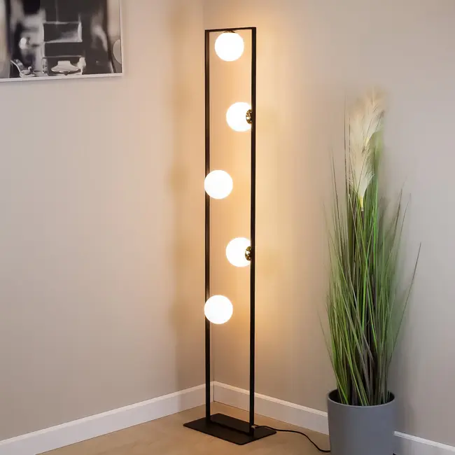 Diese moderne Stehlampe macht sich gut in einem schlichten Interieur. Der luxuriöse Look entsteht durch den eleganten schwarzen Rahmen aus hochwertigem Metall in Kombination mit den stimmungsvollen Glaskolben. Die milchig weißen Gläser verleihen dem Licht einen besonderen Glanz. Die Leuchtmittel sind nicht im Lieferumfang enthalten. Sie können also wählen, welche Lichtfarbe die Lampe ausstrahlt. So fügt sich Domien in jedes Ambiente ein.